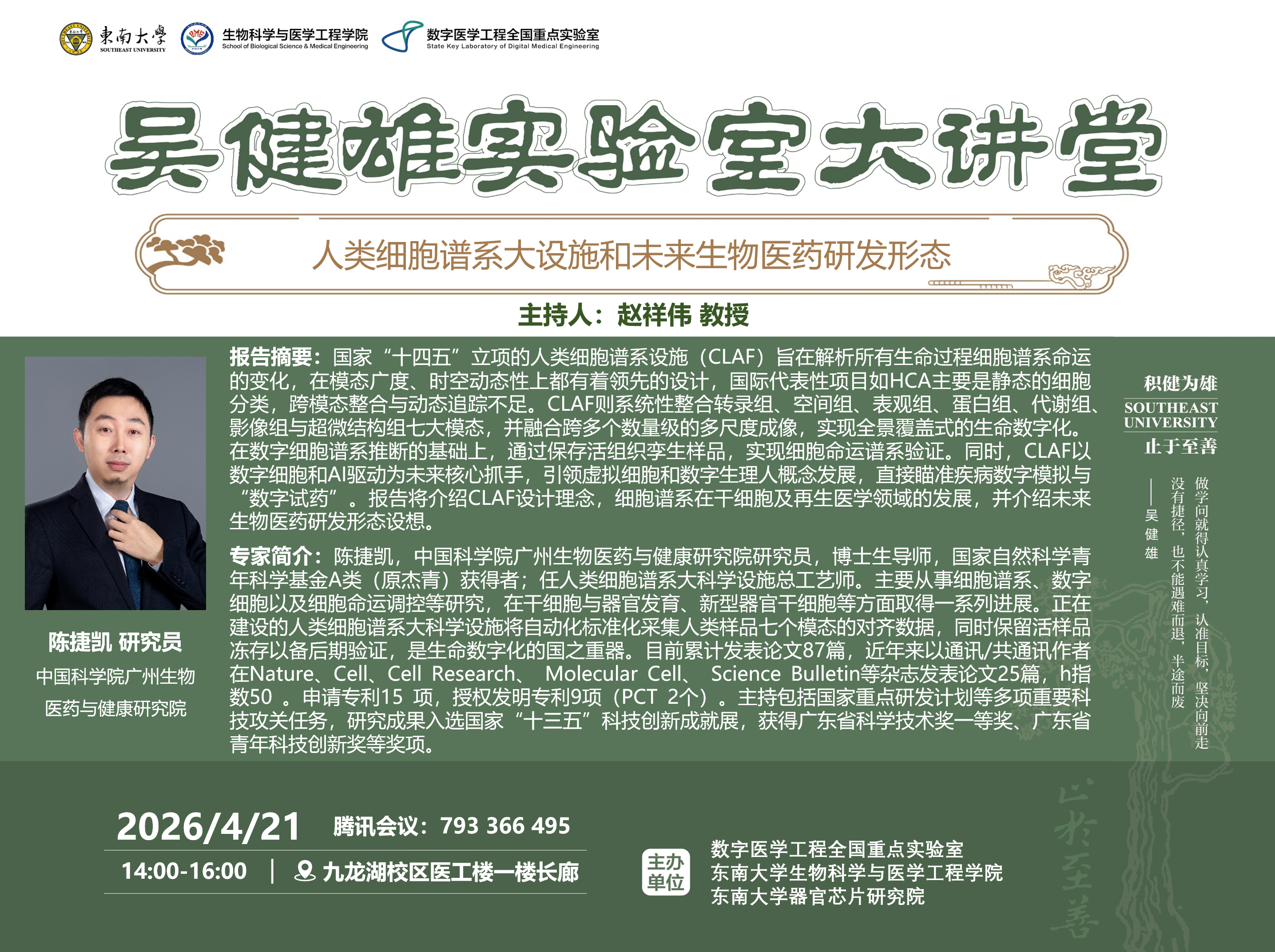 吴健雄先生是杰出女性物理学家、世界物理学界的传奇人物,被誉为“核子物理女皇”、“东方居里夫人”。作为吴健雄实验室的传承者,数字医学工程全国重点实验室、太阳澳门集团网站联合举办“吴健雄实验室大讲堂”“吴健雄实验室青年学者讲堂”系列学术报告交流分享会。
